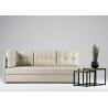 Skandynawska sofa z pikowanymi poduszkami i funkcją spania posiada dużą skrzynię na pościel i małe nogi zapewniające cyrkulacje powietrza pod meblem.