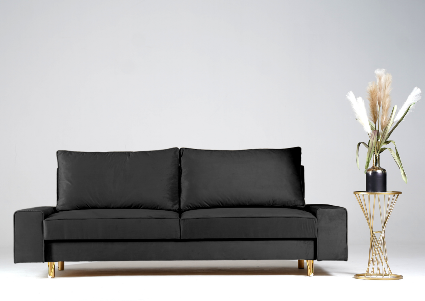 Elegancka sofa Stino z funkcją spania. Sofa na złotych nogach dodaje szyku i elegancji do naszego salonu. Sofa dzięki swoim wymiarom będzie meblem idealnym dla każdego rodzaju pomieszczeń. Duża skrzynia na pościel, duże poduszki oparciowe i piękne przeszycia to dodatkowe atuty sofy Stino. Sofa w stylu glamour.