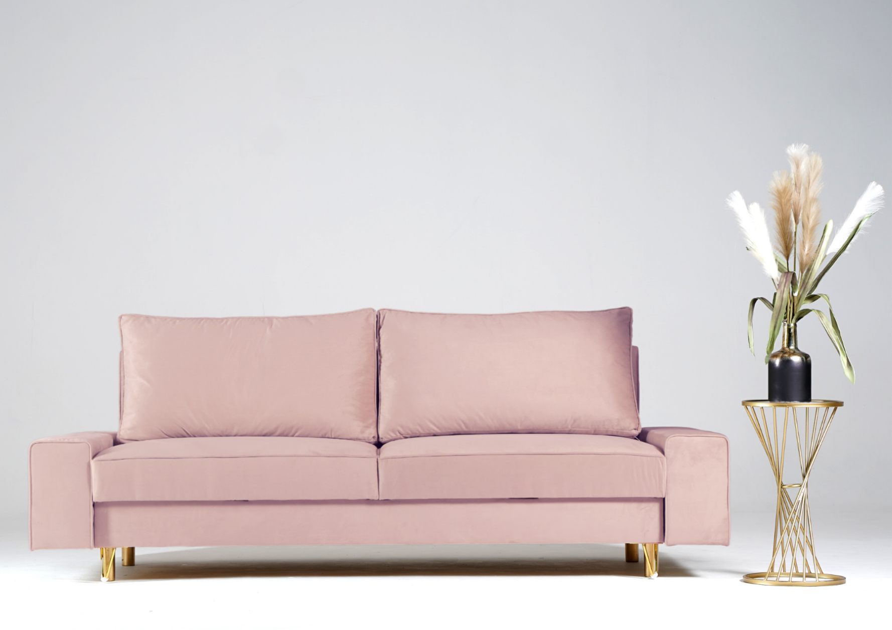 Elegancka sofa Stino z funkcją spania. Sofa na złotych nogach dodaje szyku i elegancji do naszego salonu. Sofa dzięki swoim wymiarom będzie meblem idealnym dla każdego rodzaju pomieszczeń. Duża skrzynia na pościel, duże poduszki oparciowe i piękne przeszycia to dodatkowe atuty sofy Stino. Sofa w stylu glamour.