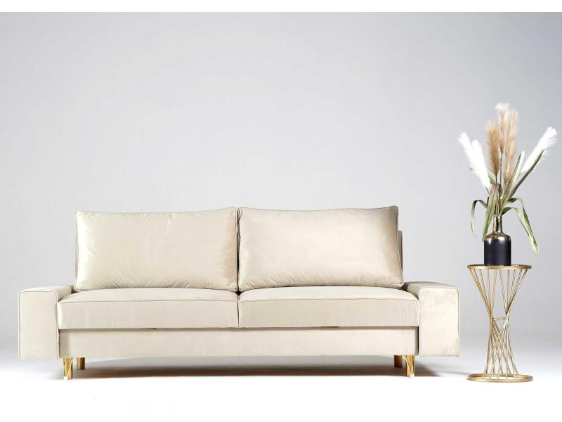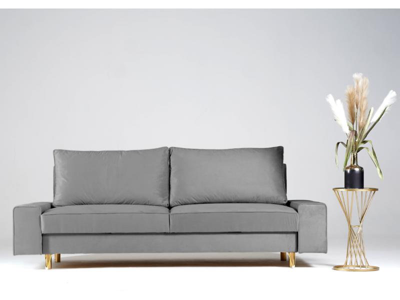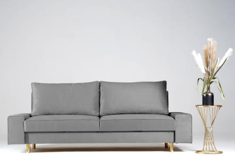 Elegancka sofa Stino z funkcją spania. Sofa na złotych nogach dodaje szyku i elegancji do naszego salonu. Sofa dzięki swoim wymiarom będzie meblem idealnym dla każdego rodzaju pomieszczeń. Duża skrzynia na pościel, duże poduszki oparciowe i piękne przeszycia to dodatkowe atuty sofy Stino. Sofa w stylu glamour.