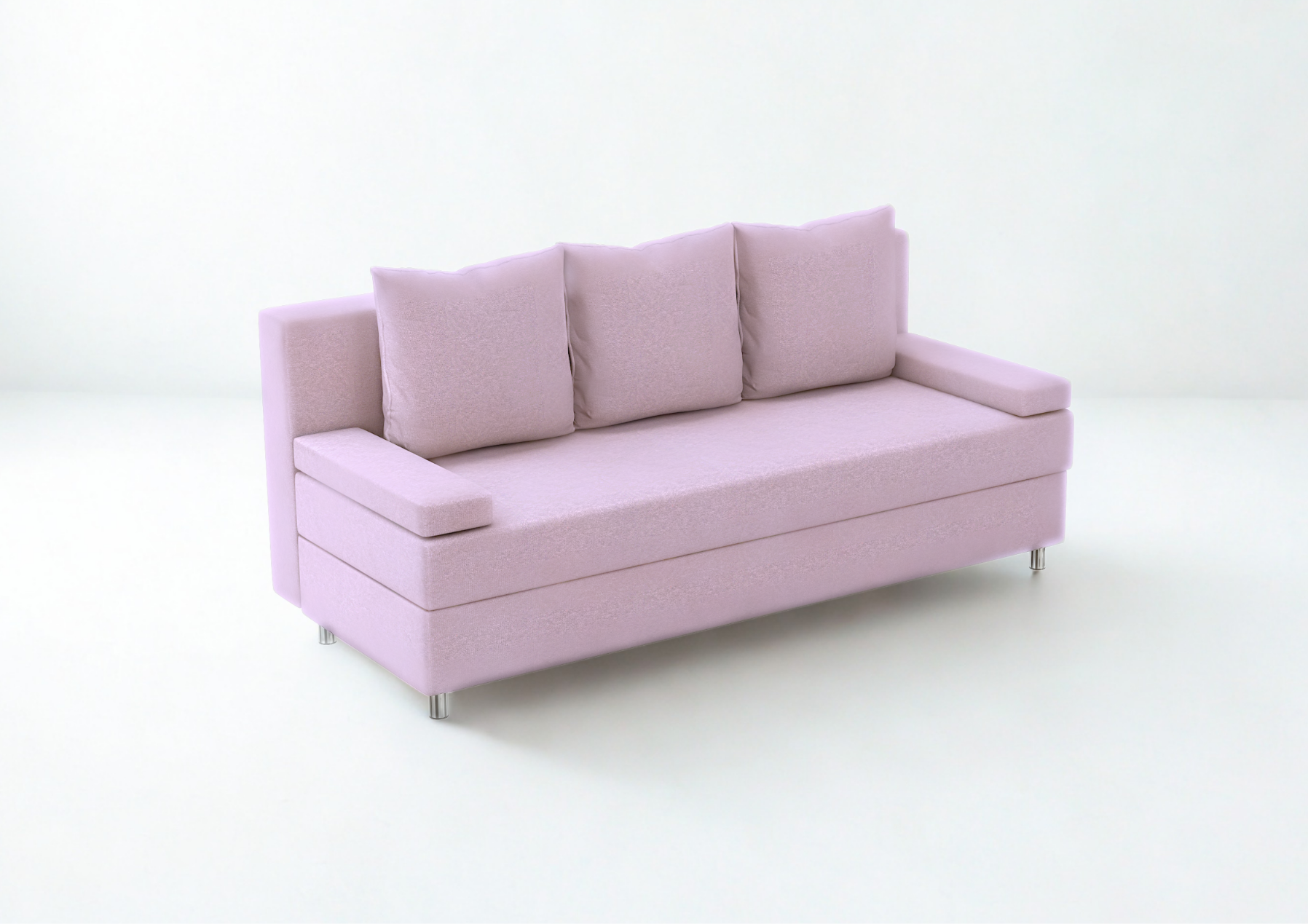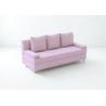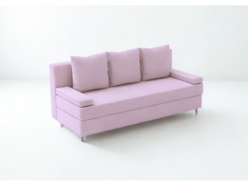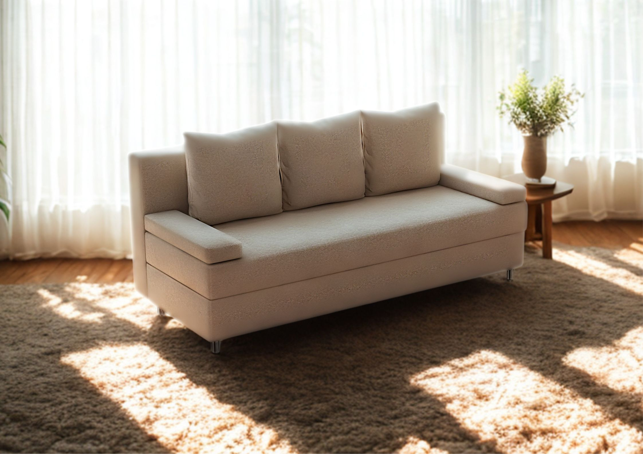 Prosta mała kanapa na srebrnych nogach o wysokości 6cm wyposażona w funkcję spania oraz dużą skrzynią na pościel. 3 duże poduszki szyte na zamkach oraz 2 piankowe podłokietniki nadają jej niebanalnego wyglądu. Sofa idealna dla małych pomieszczeń.