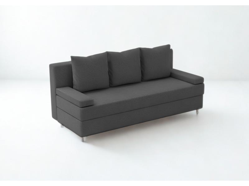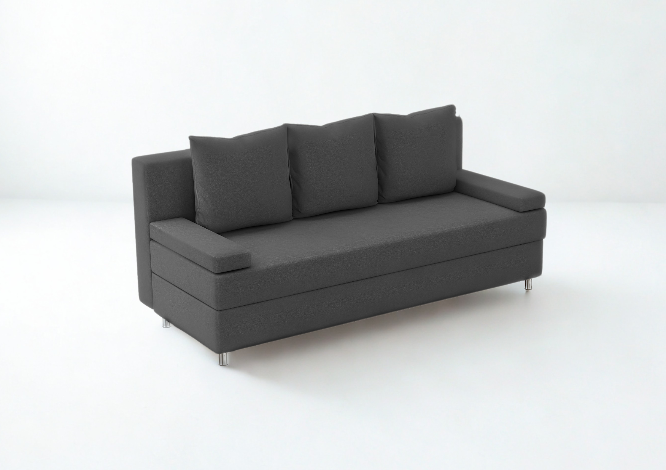Prosta mała kanapa na srebrnych nogach o wysokości 6cm wyposażona w funkcję spania oraz dużą skrzynią na pościel. 3 duże poduszki szyte na zamkach oraz 2 piankowe podłokietniki nadają jej niebanalnego wyglądu. Sofa idealna dla małych pomieszczeń.