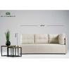 Skandynawska sofa z pikowanymi poduszkami i funkcją spania posiada dużą skrzynię na pościel i małe nogi zapewniające cyrkulacje powietrza pod meblem.
