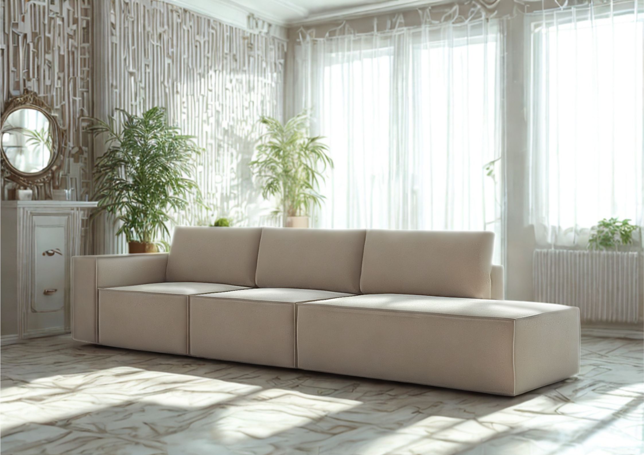 Modułowa sofa Goia to sofa, która zachwyca swoim kształtem. Idealnie nadaje się do większych wnętrz. Sofę modułową można łączyć i rozłączać tworząc z niej inne zestawy. Możesz stworzyć sofę z mniejszego i większego siedziska, oraz fotel. Dokupując u nas dodatkowe boki, poduszki zyskasz możliwość zmieniania sofy w inne mebla, w ustawieniach jakie sobie wymarzysz. Sofa modułowa jest przeszyta pięknym szwem francuskim na krawędziach. W zestawie znajdziesz 3 duże poduszki oparciowe. Kup sofę modułową Goia i ciesz się niebanalnym wyglądem i wygodą.
