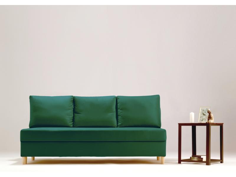 Rozkładana sofa z funkcją spania i wypełnieniem z twardej pianki oraz sprężyn bonell. Małe wymiary idealnie wpasują mebel do mniejszych pomieszczeń. Nóżki drewniane pozwolą odkurzyć pod kanapą. Skrzynia na pościel z łatwością pomieści komplet pościeli.