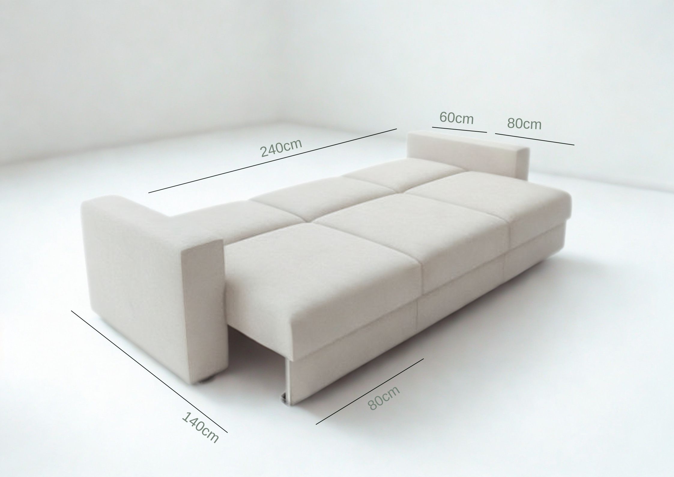 - Sofa z funkcją spania, który idealnie nada się zarówno do małego pokoju w bloku jak i w większych pomieszczeniach.