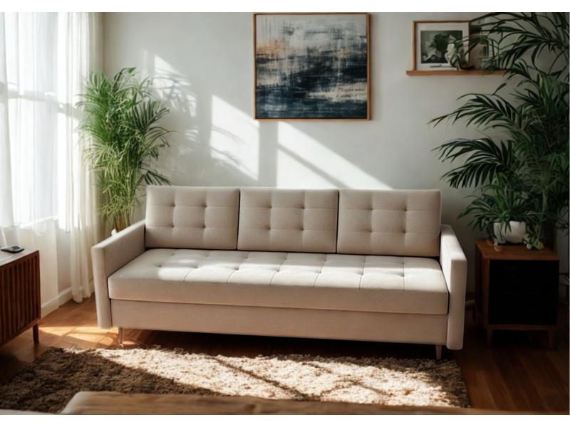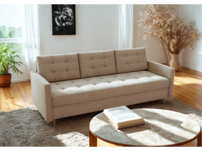 Sofa VIDO to stylowa sofa w eleganckim wydaniu glamour, która łączy nowoczesny design z codzienną funkcjonalnością. Pikowane siedzisko, wysokie drewniane nóżki oraz staranne wykończenie nadają wnętrzu wyjątkowy charakter. Sofa posiada wygodną funkcję spania o powierzchni 140x190 cm oraz praktyczną skrzynię na pościel. Zastosowanie sprężyn bonell na całej powierzchni zapewnia wysoki komfort wypoczynku i trwałość na lata. Idealna do salonu, pokoju gościnnego lub mniejszego mieszkania.