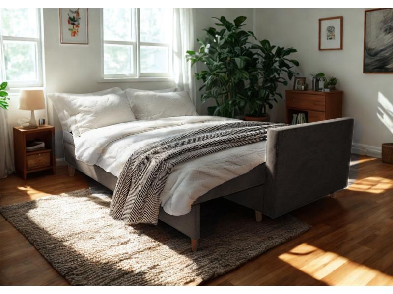 - Sofa z funkcją spania, który idealnie nada się zarówno do małego pokoju w bloku jak i w większych pomieszczeniach.