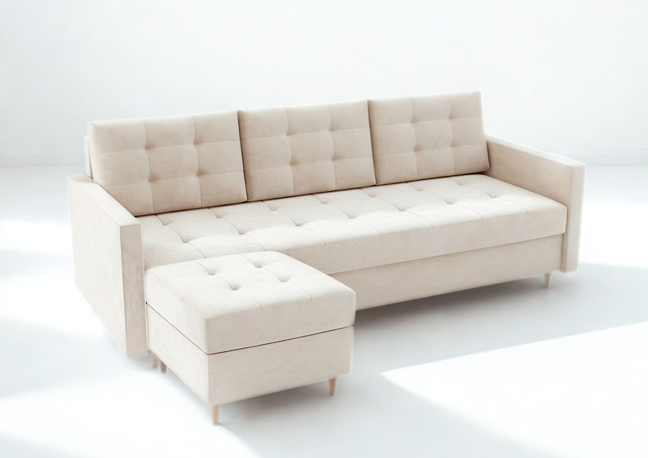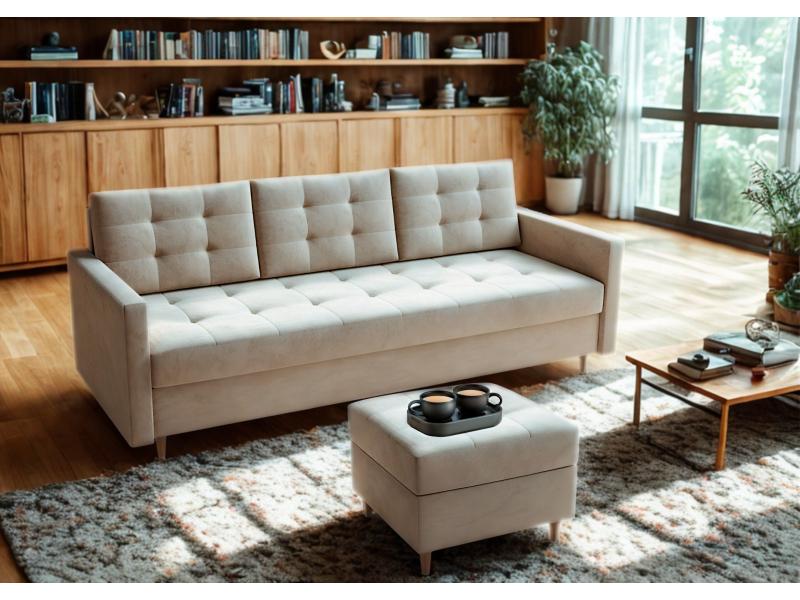⭐️Sofa VIDO z pufą Beżowa Pikowana Welur Styl Glamour Z Drewnianymi Nóżkami