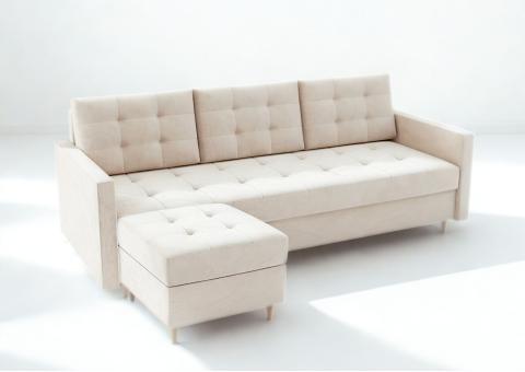 Beżowa sofa VIDO z pufą to elegancka sofa w stylu glamour, wykonana z miękkiego weluru MANILA i osadzona na drewnianych nóżkach. Pikowane siedzisko nadaje jej nowoczesny i luksusowy wygląd.